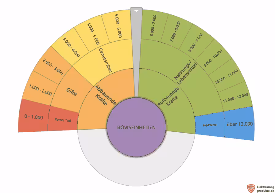 Es ist wichtig zu wissen, dass Substanzen, mit weniger als 6000 Boviseinheiten, energieraubend wirken, solche mit 6500 Boviseinheiten eher neutral wirken und jene mit mehr als 6500 Boviseinheiten energetisierend wirken.
