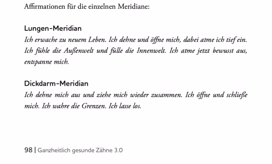 Die Affirmationen für die Meridiane 👇 werden übrigens auch im Zahnyoga-Kurs behandelt, sind aber ebenso im Buch “Die Sprache der Zähne” zu lesen. Bei regelmäßiger täglicher Wiederholung helfen sie, mentale und emotionale Blockaden in den Meridianen, die die einzelnen Zähne begleiten, zu lösen. Wenn du mehr über dieses Thema erfahren möchtest, empfehle ich dir das eben genannte Buch.